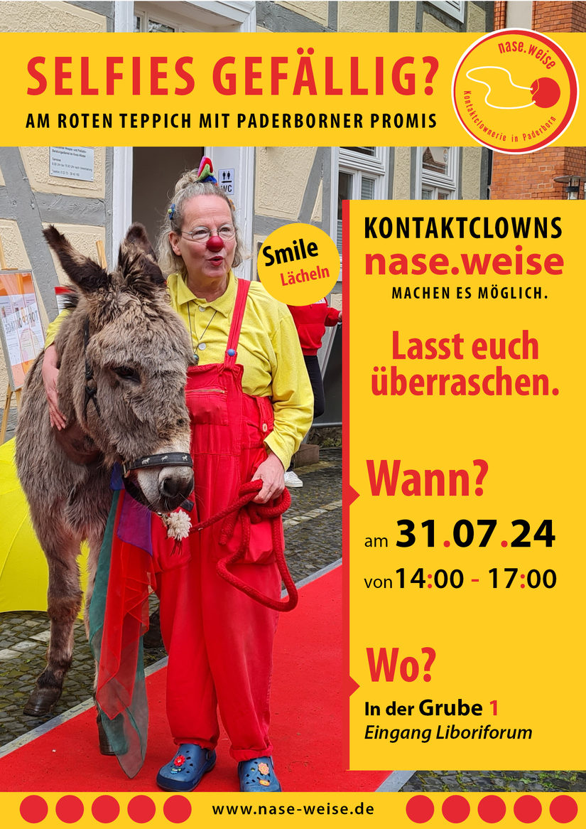 Wieder einmal verschenken die Kontaktclowns der Organisation nase.weise Leichtigkeit. Sie laden ein zum Gang über den Roten Teppich mit anschließendem Foto, Paderborner Promis eingeschlossen.