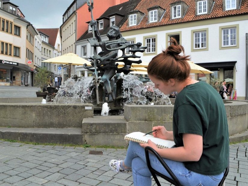 Der Neptunbrunnen auf dem Marktplatz oder das Ehrenmal am Busdorfwall – in der Innenstadt Paderborns findet man zahlreiche Werke des Bildhauers Josef Rikus. Während unserer Urban Sketching-Expedition halten wir die Skulpturen, aber auch deren städtische Umgebung zeichnerisch fest. Im Vergleich mit alten Fotografien beschäftigen wir uns zudem mit der Frage, wie sich der Öffentliche Raum im Laufe der Jahrzehnte gewandelt hat und wie sich dies auf die Wahrnehmung der Werke auswirkt.