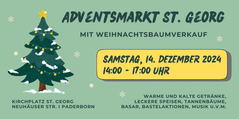 Die Gemeinde St. Georg lädt am Samstag, den 9.12.2023 von 14-17 Uhr auf dem Vorplatz der Kirche (Neuhäuserstraße 78 in Paderborn) ein.