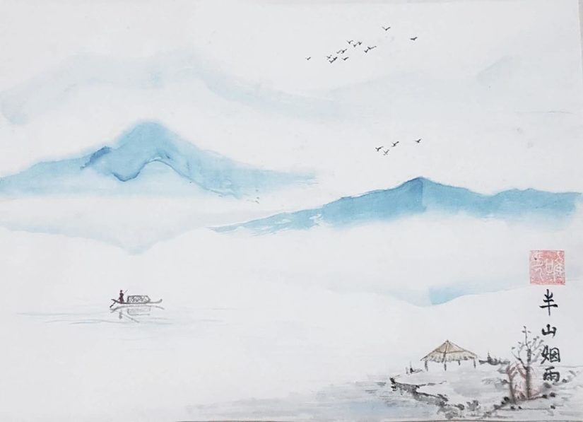 Das Motiv, welches wir gemeinsam im Dezember malen werden sind „Nebeliger Regen mitten auf dem Berg 半山烟雨“.