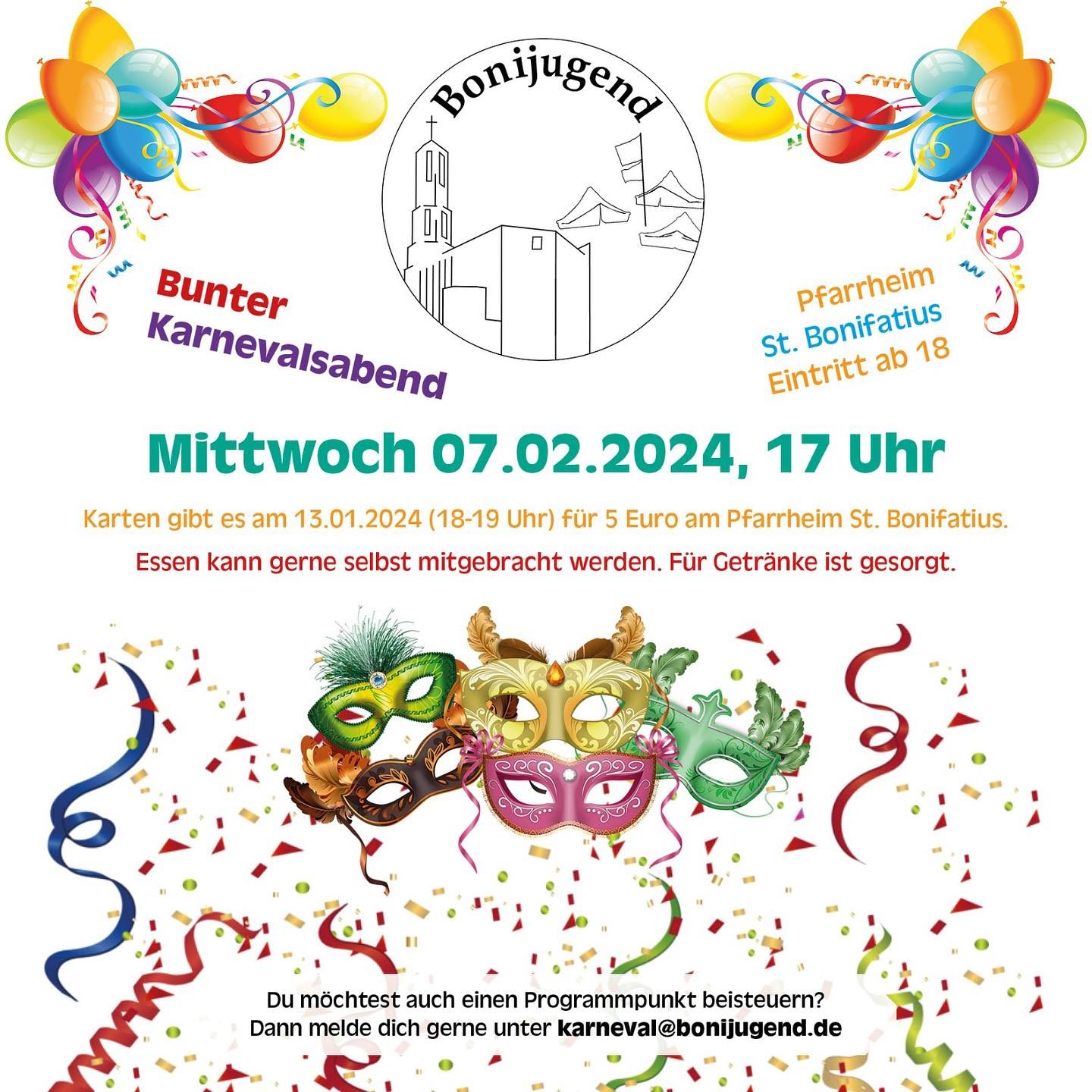 Die Bonijugend lädt zu einem bunten Karnevalsabend mit Programm ein. Der bunte Karnevalsabend richtet sich an Erwachsene aller Altersgruppen ab 18 Jahren.