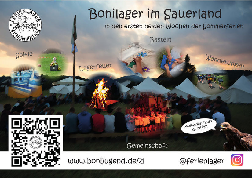 Die Pfarrei St. Bonifatius in der Paderborner Stadtheide bietet in den ersten beiden Wochen der Sommerferien zum 41. Mal ein 14-tägiges Zeltlager im Sauerland an. Das Angebot richtet sich an Kinder im Alter von 9 bis einschließlich 15 Jahren. Ziel für das Zeltlager von Samstag, 12.07. bis Freitag, 25.07.2024 ist Langenholthausen (Sauerland), in dem das Ferienlager zuletzt 2013 zu Gast war.