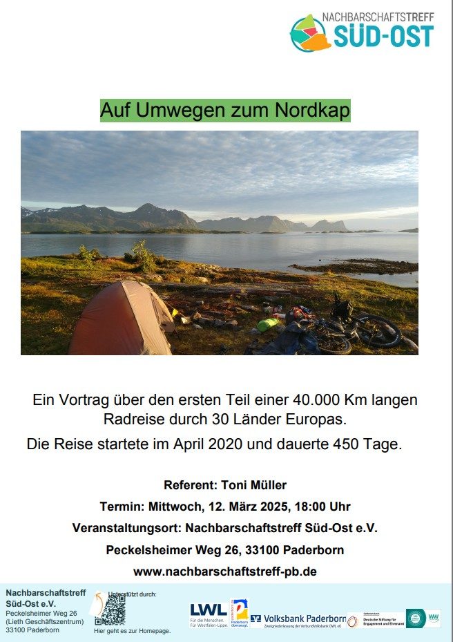 Auf Umwegen zum Nordkap Ein Vortrag über den ersten Teil einer 40.000 Km langen Radreise durch 30 Länder Europas. Die Reise startete im April 2020 und dauerte 450 Tage. Referent: Toni Müller