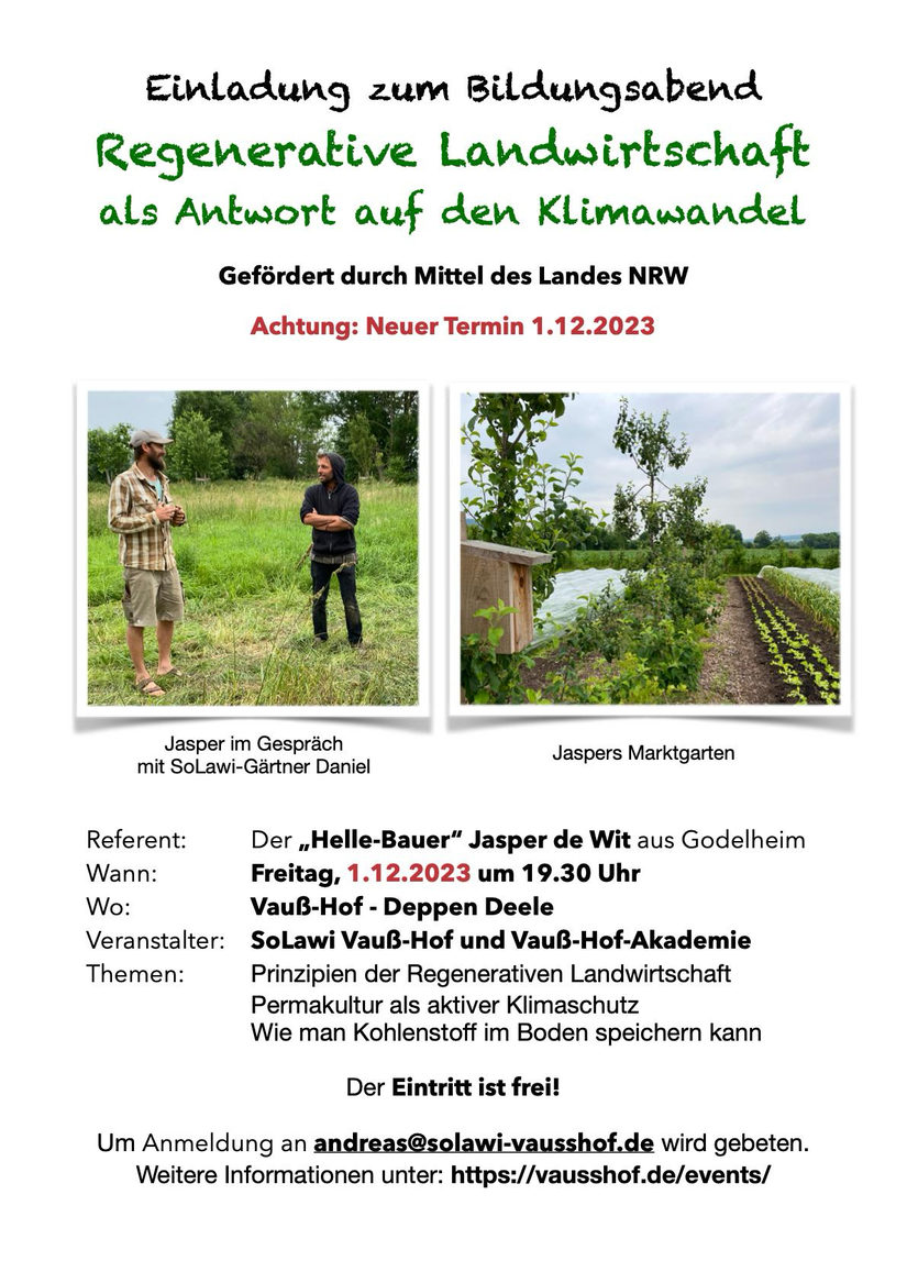 Die Solidarische Landwirtschaft Vauß-Hof lädt ein zum Vortragsabend mit Helle-Bauer Jasper de Witt zum Thema Regenwrative Landwirtschaft.