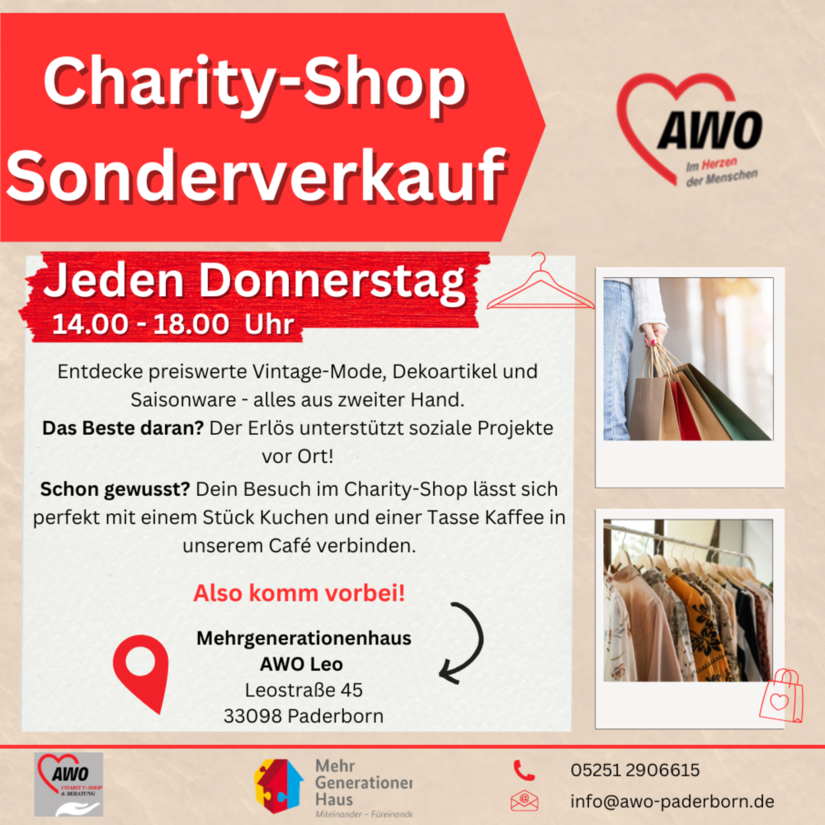Aufgrund der positiven Nachfrage und des umfangreichen Sortiments öffnet der Charity-Shop-Sonderverkauf der AWO (Leostraße 45) ab sofort jeden Donnerstag in der Zeit von 14.00-18.00 Uhr.
