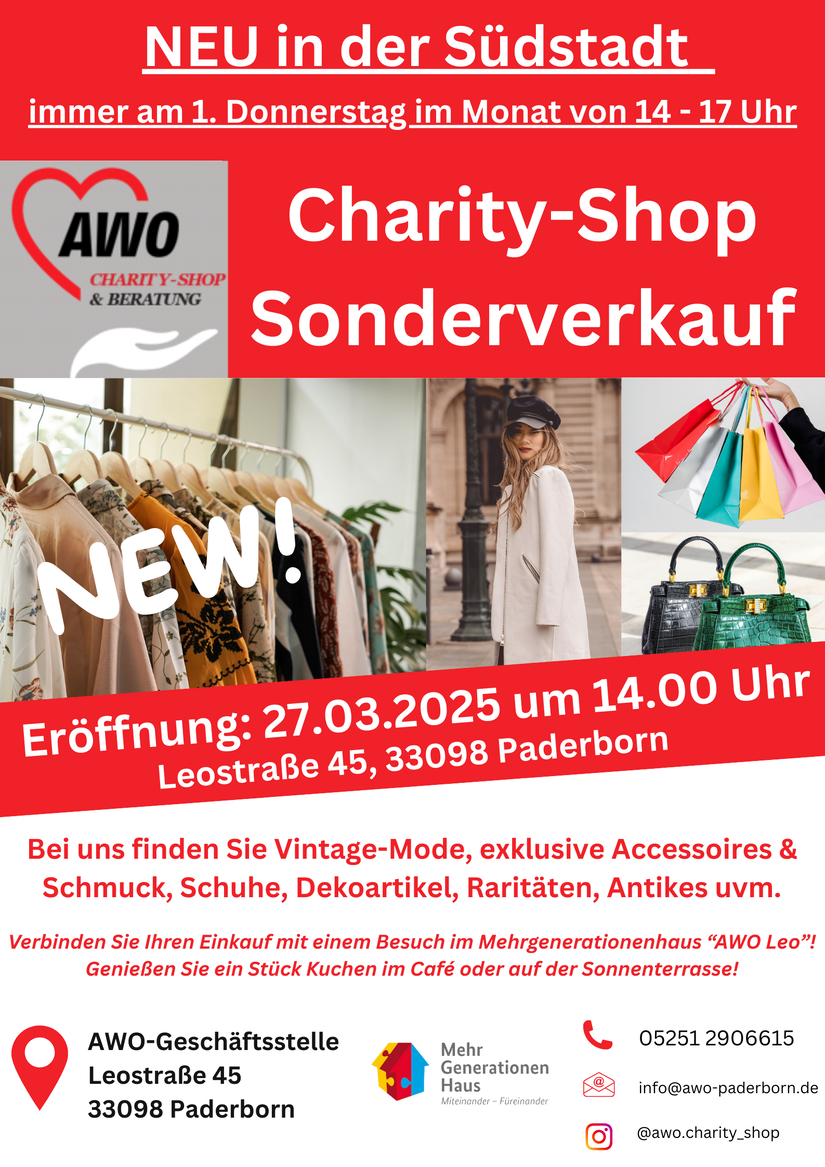 Die AWO eröffnet am 27.03.2025 ab 14.00 Uhr in der Leostraße 45 ihren neuen, regelmäßigen Charity-Shop-Sonderverkauf.