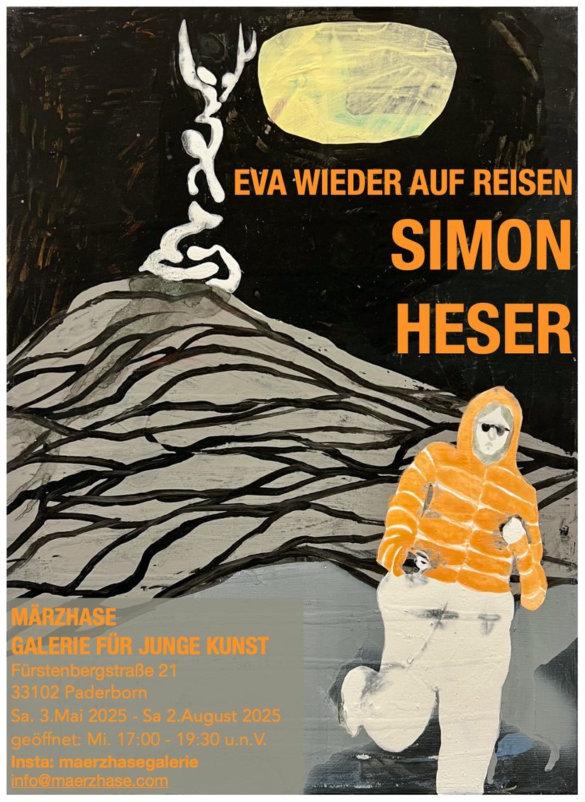 SIMON HESER, Meisterschüler von Siegfried Anzinger an der Kunstakademie Düsseldorf, war mit seinen malerischen und graphischen Arbeiten bereits 2 mal in der Galerie Märzhase zu sehen. Jetzt präsentiert die Galerie seine erste Einzelausstellung. EVA WIEDER AUF REISEN.
