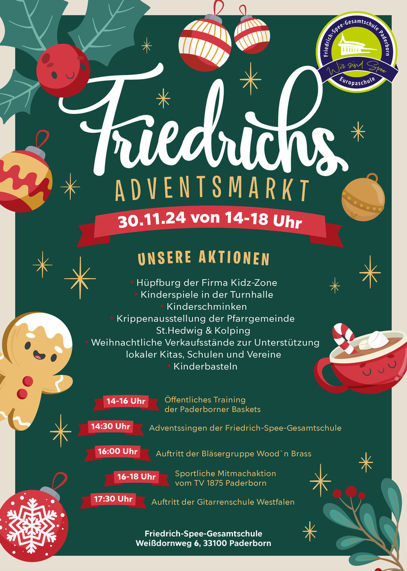 Am 30. November 2024 verwandelt sich das Gelände der Friedrich-Spee-Gesamtschule zum zweiten Mal in einen weihnachtlichen Treffpunkt für Groß und Klein. Von 14 bis 18 Uhr lädt Friedrichs Adventsmarkt dazu ein, die Vorweihnachtszeit in Gemeinschaft zu erleben und dabei Gutes zu tun. Das bunte Programm bietet für jeden etwas: Die Paderborner Baskets werden mit sportlichen Einlagen begeistern, während der Musikworkshop der Gitarrenschule Westfalen speziell für die Kleinsten von 1 bis 5 Jahren ein Highlight darstellt. Die Bläsergruppe Wood'n Brass und der Chor der Friedrich-Spee-Gesamtschule werden mit festlichen Klängen die weihnachtliche Atmosphäre verstärken. Für die jüngsten Besucher steht eine Hüpfburg bereit, während sich Kinder beim Kinderschminken in fantasievolle Wesen verwandeln können. Ein besonderes Highlight des Marktes sind die Verkaufsstände von Schulen, Kitas und Vereinen aus den Stadtteilen Kaukenberg, Lieth, Goldgrund und Springbach Höfe. Hier können Besucher selbst hergestellte Produkte erwerben und somit die soziale Arbeit in ihren Quartieren unterstützen, da die Einnahmen der Stände direkt an die jeweiligen Institutionen gehen. Der Adventsmarkt verspricht nicht nur festliche Unterhaltung, sondern setzt auch ein starkes Zeichen für Solidarität und soziales Engagement in der Vorweihnachtszeit. Kommen Sie vorbei und erleben Sie gemeinsam eine besinnliche Zeit im Herzen unserer Gemeinschaft - eine perfekte Einstimmung auf die bevorstehende Weihnachtszeit. Wir freuen uns auf Sie auf dem Gelände der Friedrich-Spee-Gesamtschule begrüßen zu können.