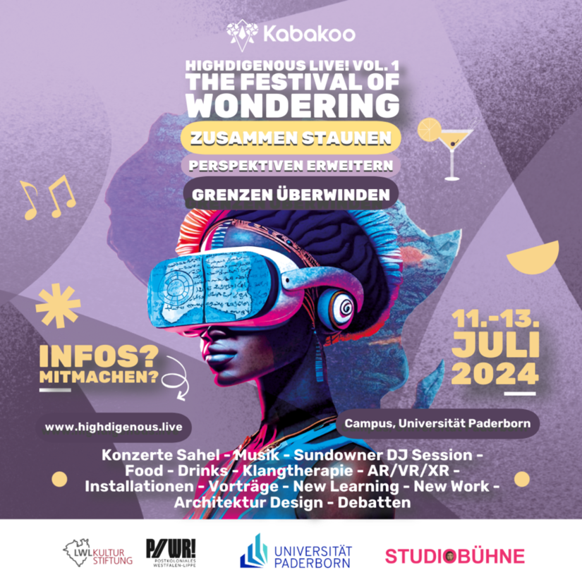 Das "Highdigenous Live! Das Festival des Staunens" ist ein multidisziplinäres Projekt mit dem Ziel, bestehende koloniale Strukturen zu hinterfragen und überwinden zu helfen. Es will zur Aufarbeitung kolonialer Strukturen beitragen und das Bewusstsein für koloniale Verstrickungen schärfen. Durch kollaborative Workshops, Debatten, XR-Erfahrungen und Live-Musik unter aktiver Beteiligung von Gästen aus der Sahelzone soll ein Raum geschaffen werden, in dem unterschiedliche Teilnehmer*innen ihre Perspektiven erweitern und ihr Verständnis für koloniale Themen kritisch vertiefen können. Höhepunkt des Projekts ist ein dreitägiges Festival in Paderborn (Deutschland), das neueste Technologien und endogene Wissensformen zu den drei Themen Bauen & Wohnen, Musik und Innovation zusammenbringt, um neue Perspektiven auf unsere Realitäten und mögliche Zukünfte zu schaffen.