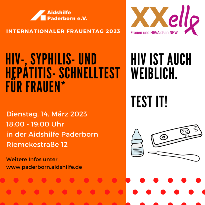 Am 14. März von 18.00 – 19.00 Uhr sind verschiedene Schnelltests zu o.g. sexuell übertragbaren Infektionen für Frauen* möglich. Vor jedem Test wird eine qualifizierte Beratung durch die hauptberuflich Mitarbeitenden der Aidshilfe Paderborn angeboten. Eine Person im ärztlichen Dienst ist bei der Durchführung der Schnelltests anwesend. Alle angebotenen Tests sind anonym. Es müssen keine persönlichen Daten mitgeteilt werden.