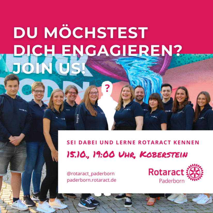 Du möchtest dich engagieren, Neues lernen und neue Kontakte knüpfen? Dann schau bei unserem Info-Meeting am 15.10. um 19:00 Uhr im Koberstein vorbei. Wir sind der Rotaract Club Paderborn.