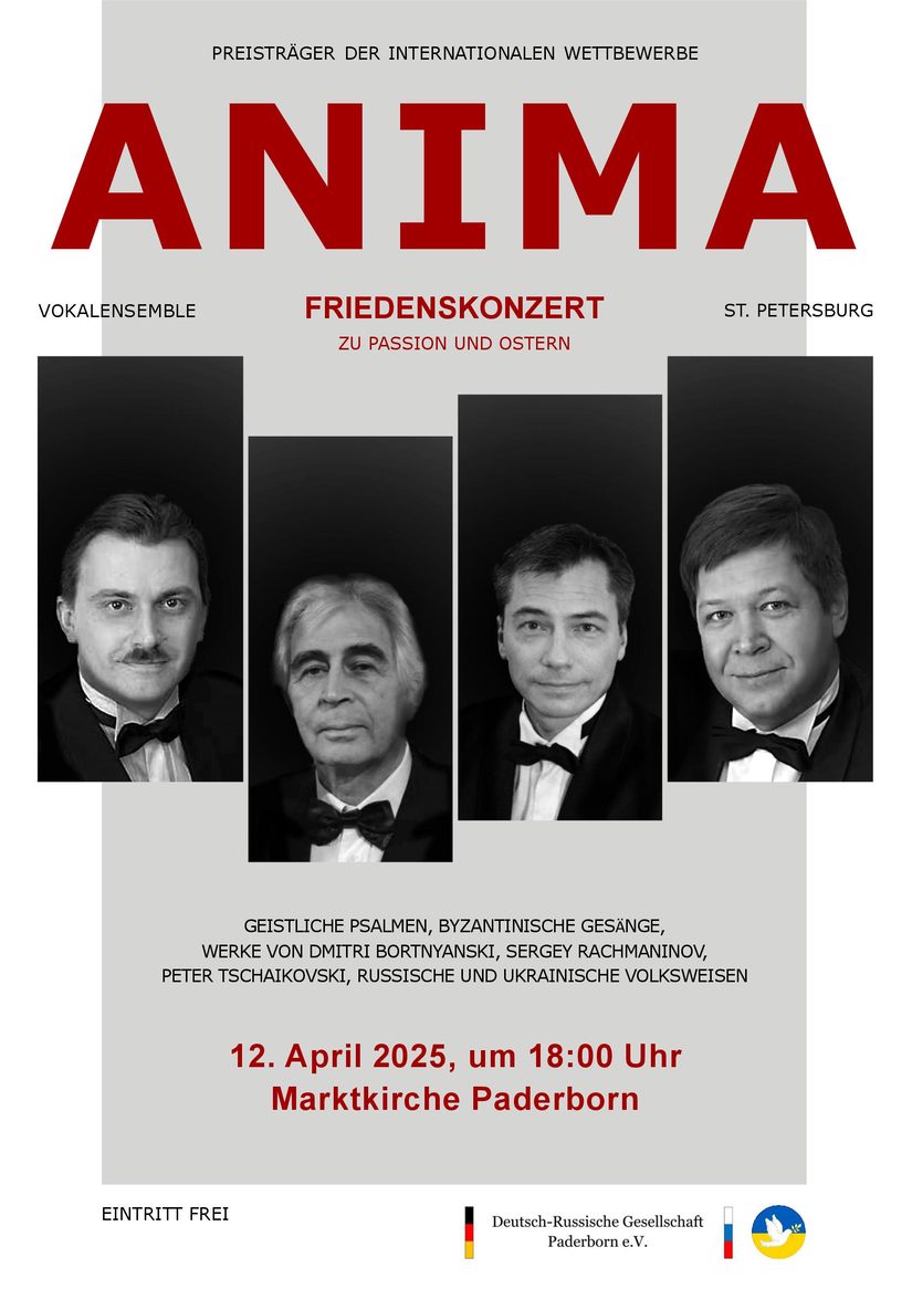Am Samstag, den 12. April 2025, um 18:00 Uhr, lädt die Deutsch-Russische Gesellschaft Paderborn zu einem besonderen Friedenskonzert mit dem renommierten Vokalensemble „Anima“ in die Marktkirche Paderborn (Kamp 1) ein.