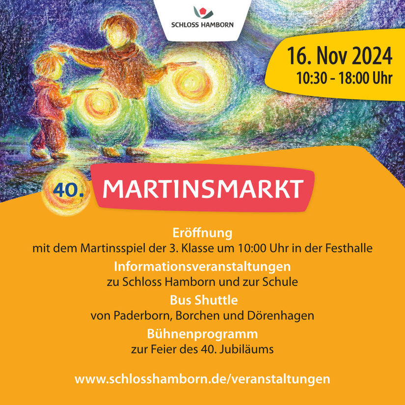 Die Schulgemeinschaft der Rudolf‐Steiner‐Schule Schloss Hamborn feiert 40 Jahre Martinsmarkt und lädt am Samstag, den 16. November 2024 zur Jubiläums-Veranstaltung ein. Von 10.30 – 18.00 Uhr stehen auf dem Gelände von Schule und Kindergarten wieder zahlreiche Angebote zum Mitmachen, Erfreuen und Genießen bereit.