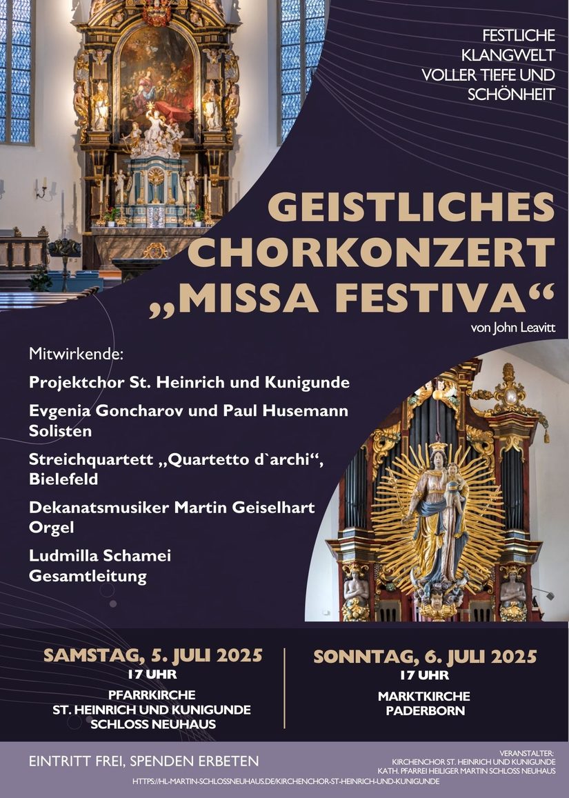 Nach sechsmonatiger, intensiver Probezeit lädt der Projektchor St. Heinrich und Kunigunde Schloß Neuhaus zu einem besonderen musikalischen Ereignis ein: die festliche Konzertaufführung der Missa Festiva des amerikanischen Komponisten John Leavitt. Das Werk erklingt am 5. Juli 2025 um 17 Uhr in der Pfarrkirche St. Heinrich und Kunigunde Schloß Neuhaus sowie am 6. Juli 2025 um 17 Uhr in der Marktkirche in Paderborn.
