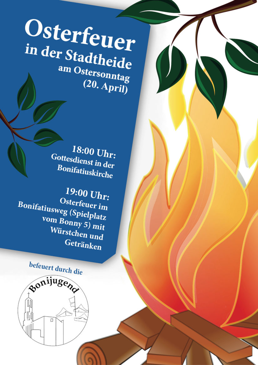 Die Bonijugend lädt am Ostersonntag zum traditionellen Osterfeuer in der Stadtheide ein. Das Osterfeuer wird erneut am Bonifatiusweg auf der Wiese gegenüber dem Bonny 5 stattfinden. Bevor das Osterfeuer um ca. 19:00 Uhr entzündet wird, lädt die Kath. Kirchengemeinde St. Bonifatius ab 18:00 Uhr zu einem Gottesdienst ein.