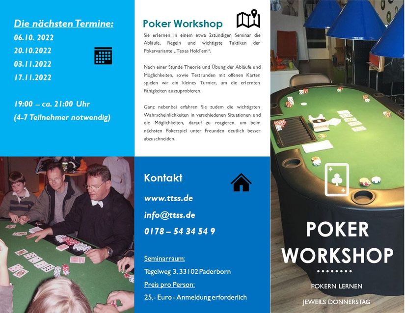 Sie erlernen in einem etwa 2stündigen Seminar die Abläufe, Regeln und wichtigste Taktiken der Pokervariante „Texas Hold´em“. Nach einer Stunde Theorie und Übung der Abläufe und Möglichkeiten, sowie Testrunden mit offenen Karten spielen wir ein kleines Turnier, um die erlernten Fähigkeiten auszuprobieren.