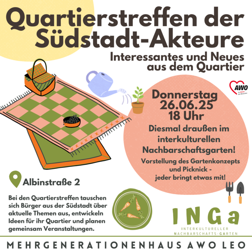 Am 26.06.2025 um 18Uhr sind alle Südstädter/innen und alle Interessierten wieder zum Quartierstreffen eingeladen. Diesmal treffen wir uns im interkulturellen Nachbarschaftsgarten in der Albinstraße 2.
