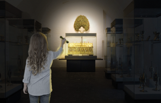 Unter dem Museumsgebäude verbirgt sich ein mittelalterlicher Gewölbekeller, in dem etwas ganz Besonderes aufbewahrt wird: der Schatz des Paderborner Doms. Wir begeben uns hinab und erkunden diesen geheimnisvollen Ort. Im Licht der Taschenlampen entfalten die goldenen und mit Edelsteinen besetzten Gefäße, Figuren und Bischofsstäbe eine ganz besondere Wirkung. Auch der Schrein des heiligen Liborius und seine vielen kunstvoll gearbeiteten Details können hier aus nächster Nähe betrachtet werden.