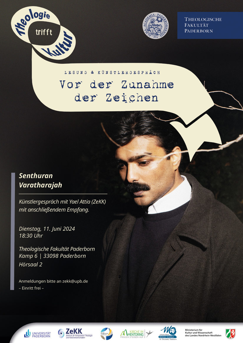 Senthuran Varatharajah liest im Hörsaal 2 der Theologischen Fakultät Paderborn im Rahmen der Reihe „Theologie trifft Kultur“ aus seinem Debütroman „Vor der Zunahme der Zeichen“. Der junge Theologe, Philosoph und Schriftsteller schreibt über Herkunft und Ankunft, über Erinnern und Vergessen und über die Brüche in Biographien. Anschließend wird er darüber mit Yael Attia, Mitarbeiterin am Zentrum für Komparative Theologie und Kulturwissenschaften (ZeKK) im Bereich der Jüdischen Studien, ins Gespräch kommen. Die Veranstaltung findet im Rahmen der Ökumenischen Studientage „Ökumene in der Migrationsgesellschaft“ des Johann-Adam-Möhler-Instituts für Ökumenik Paderborn vom 10. bis 12. Juni 2024 statt. Der Eintritt ist frei.