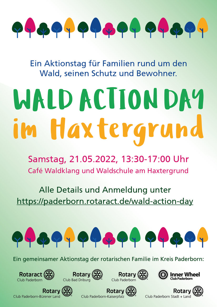 Gemeinsam mit sechs weiteren rotarischen Clubs aus der Region Paderborn und Bad Driburg laden wir vom Rotaract Club Paderborn am 21. Mai 2022 ab 13:30 Uhr zum WALD ACTION DAY in den Haxtergrund in Paderborn ein.