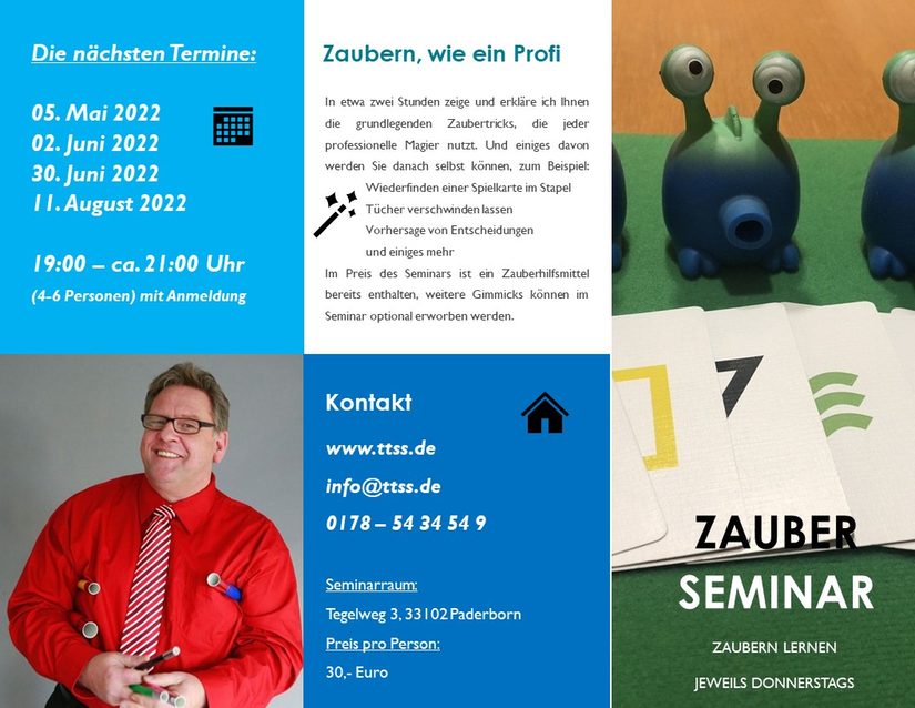 Im Preis des Seminars ist ein Zauberhilfsmittel bereits enthalten, weitere Gimmicks können im Seminar optional erworben werden.