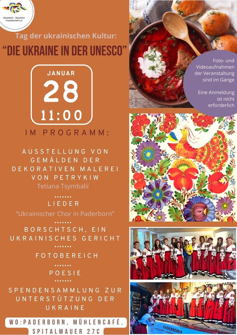 Wir laden Sie herzlich ein, am 28. Januar um 11:00 Uhr das Fest zur ukrainischen Kultur 'Die Ukraine in der UNESCO' im Mühlencafé, Spitalmauer 27c, in Paderborn zu besuchen.