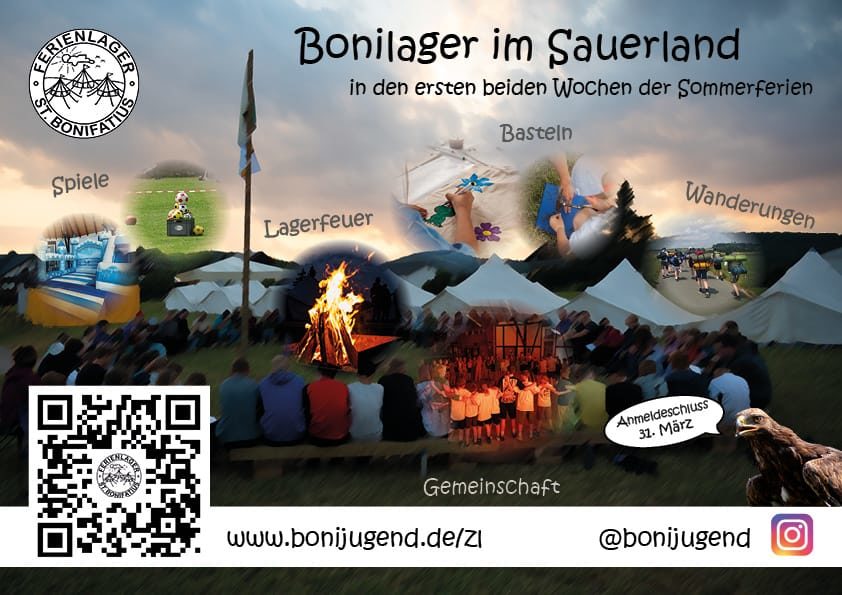 Die Bonijugend aus der Pfarrei St. Bonifatius in der Paderborner Stadtheide bietet in den ersten beiden Wochen der Sommerferien zum 40. Mal ein 14-tägiges Zeltlager im Sauerland an. Das Angebot richtet sich an Kinder im Alter von 9 bis einschließlich 15 Jahren. Ziel für das Zeltlager von Samstag, 06.07. bis Freitag, 19.07.2024 ist Meinkenbracht (Sauerland), in dem das Ferienlager zuletzt 2002 zu Gast war.