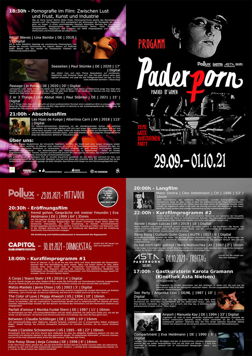 Vom 29.09. bis zum 01.10. findet im Pollux, dem Capitol sowie dem AStA Stadtcampus ein Filmfestival statt, das durch Filmvorführungen digitaler und analoger Werke sowie Gespräche mit renommierten Gästen besticht. Im Rahmen eines Seminars der Universität Paderborn entstand die Idee zu „Paderporn“, einer Veranstaltung, die auf mehreren Ebenen den oft verrufenen Pornofilm von einer neuen Seite zeigen will.