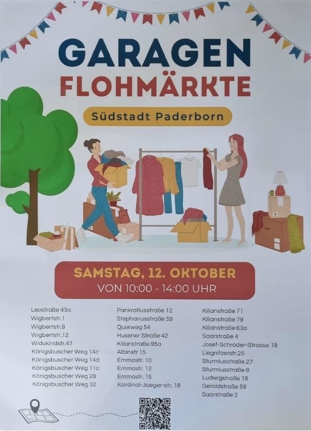 Am 12. Oktober 2024 ist es wieder soweit: Der Südstadt-Flohmarkt geht in die 3. Runde! Wieder verwandeln zahlreiche Anwohner*innen ihre Einfahrten und Vorgärten in kleine Schatzkammern voller Überraschungen, ganz nach dem Motto: Aus der Südstadt- für Paderborn!