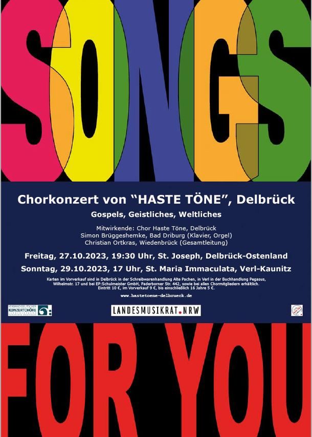 Karten im Vorverkauf sind in der Schreibwarenhandlung Alte Pachen in Delbrück, in der Buchhandlung Pegasus, Wilhelmstr. 17, bei EP:Schulmeister GmbH, Paderborner Str. 442 und bei allen Chormitgliedern zum Preis von 9€ (ermäßigt 5€) erhältlich. Kinder/ Jugendliche bis 16 Jahren zahlen keinen Eintritt.