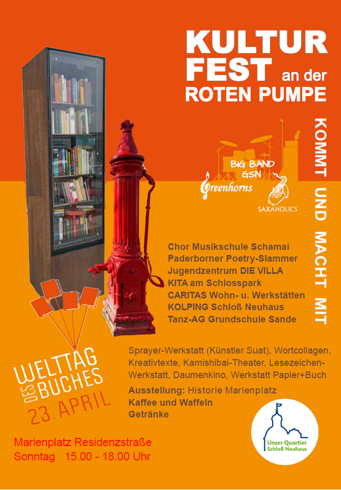 Sie befinden sich hier:StartseiteTourismus KulturVeranstaltungenVeranstaltungskalenderKulturfest zum Welttag des Buches Kulturfest zum Welttag des Buches VeranstaltungsinformationenSonntag, 23. April 2023 15:00 bis 18:00© Stadt Paderborn