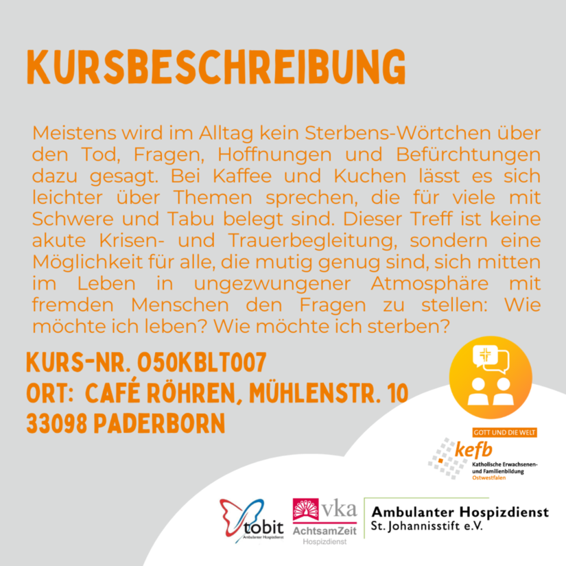 In vielen Städten gibt es ein Gesprächsangebot, das unter dem Namen „Death-Café“ bekannt wurde. Jetzt bieten die Mitarbeitenden des ambulanten Hospizdienstes Tobit diesen Treff auch in Paderborn an.