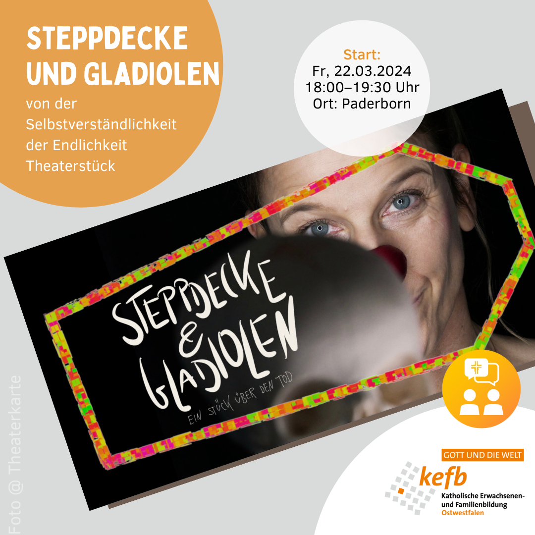 In sowohl berührenden wie auch komischen Szenen erzählt "Steppdecke und Gladiolen" von unserem Umgang und Nicht-Umgang mit dem Tod. Im Anschluss sind die Teilnehmenden zum Austausch eingeladen.