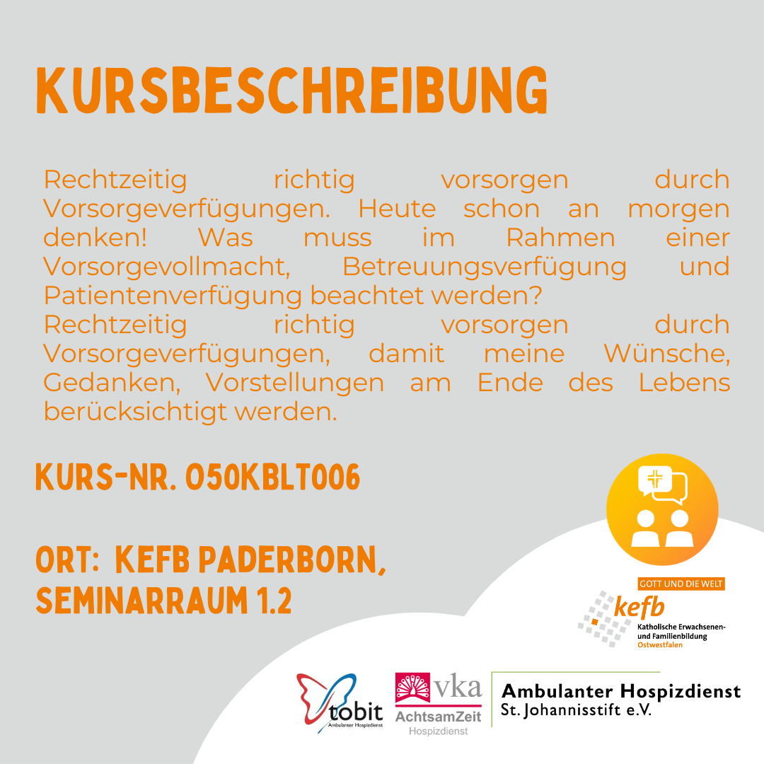 Der Kurs wird von Barbara Heusipp vom AWO Betreuungsverein durchgeführt und findet in Kooperation mit dem Ambulanten Hospizdienst Tobit , dem Ambulanten Hospizdienst St. Johannisstift e. V. und dem VKA Achtsamzeit Hospizdienst statt.