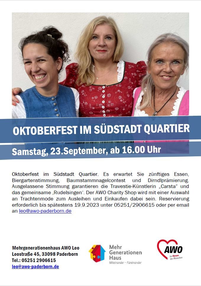 Sie befinden sich hier:StartseiteTourismus KulturVeranstaltungenVeranstaltungskalenderOktoberfest im Südstadt Quartier Oktoberfest im Südstadt Quartier Veranstaltungsort VeranstaltungsinformationenSamstag, 23. September 2023 16:00 bis 22:00© AWO LeoInformationenBeginn16:00 UhrAnmeldungReservierung erforderlich bis spätestens 19.9.2023 unter 05251/2906615 oder per email an leo@awo-paderborn.deVeranstaltungsort Mehrgenerationenhaus AWO Leo