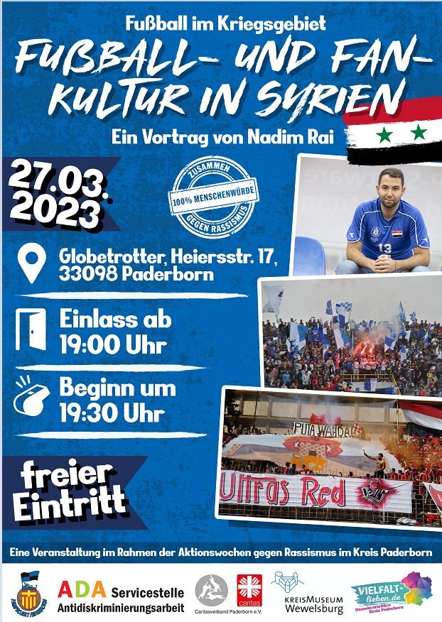 In einer auf den Kopf gestellten Welt haben die syrischen Ultras immer noch etwas mit allen Ultras dieser Welt gemeinsam: Die Liebe zum Fußball und zum eigenen Verein. Doch es geht ihnen nicht nur um den Sport! Sie wirken mit ihrem Engagement auch in die gespaltene Gesellschaft hinein. Mit einem kurzen Film und einem Vortrag vom Syrer Nadim Rai aus wird nachgezeichnet, wie sich der Fußball und mit ihm die Fanszene in den letzten Jahren entwickelt haben und wie sich die Ultrabewegung positiv auf die Gesellschaft auswirkt. Im Anschluss wird es Raum für Fragen geben. Der Vortrag wird auf Deutsch gehalten