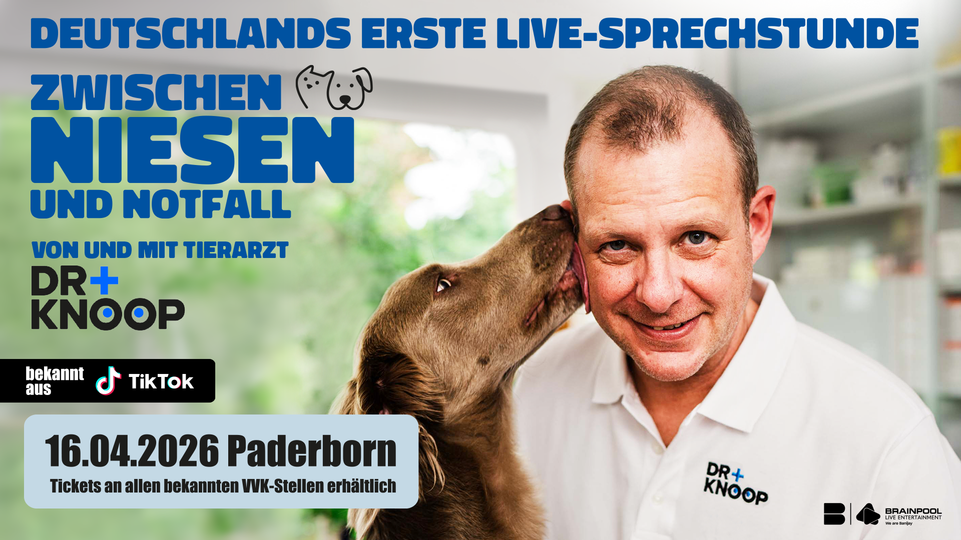 Dr. Knoop kennt sie alle, die kleinen und großen Probleme unserer tierischen Mitbewohner und die Sorgen der Tierbesitzer. Mit seinen unterhaltsamen und informativen Videos begeistert er auf TikTok und Instagram eine stetig wachsende Community – jetzt bringt er seine beliebte Online-Sprechstunde erstmals live auf die Bühne!
