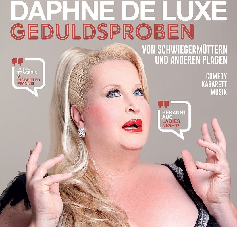 Geduld ist wahrlich nicht ihre Stärke und so bringt Daphne de Luxe mit „Geduldsproben“ ein Programm auf die Bühne, das authentischer und amüsanter kaum sein kann. „Von Schwiegermüttern und anderen Plagen“ lässt schnell erahnen, wer Dreh- und Angelpunkt dieses Comedy-Programms ist: Die Schwiegermutter. Die ist kürzlich mit ins Haus gezogen und bringt im wahrsten Sinne des Wortes so manch „reizende“ Situation mit sich.Doch sie ist nicht die Einzige, die Daphne de Luxe in ihrem Dasein plagt und so sinniert die Meisterin der Selbstironie in „Geduldsproben“ über Sinn & Unsinn komischer Angewohnheiten und die Merkwürdigkeiten des Älterwerdens, philosophiert über den Menschen im Allgemeinen und lässt sich in amüsanter Art und Weise über Situationen aus, die ihre Geduld ernsthaft auf die Probe stellen. Denn die lauern einfach überall: beim Arztbesuch, im Supermarkt, bei Behördengängen oder in der virtuellen Welt. Sie kennen das! Wenn Daphne de Luxe die Herausforderungen ihres Alltags auf humorvolle Weise ausführt, wundert es kaum, dass die biblischen Plagen, im Vergleich dazu, fast wie eine Kleinigkeit wirken. Die Humoristin überzeugt auch in ihrem fünften Comedy-Programm mit ihrer ganz besonderen Mischung aus stilvollem Auftritt, amüsanter Unterhaltung, augenzwinkernder Selbstironie, kabarettistischem Tiefgang, bedingungsloser Authentizität und berührendem Gesang. Neue Lieder und Anekdoten, jede Menge Humor und Selbstironie sorgen für gnadenlos gute Unterhaltung und lassen die Zuschauer für mindestens zwei Stunden ihren Alltag vergessen oder herzlich über die eigenen Geduldsproben des Lebens lachen.