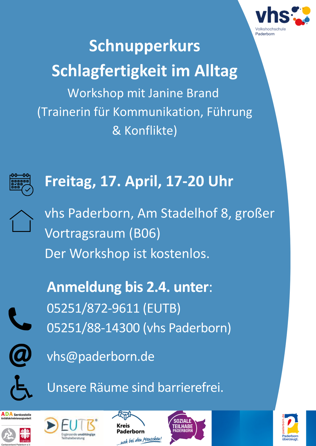 Das Angebot richtet sich an alle interessierten Menschen mit Behinderung, die ihre kommunikativen Fähigkeiten stärken und mehr Sicherheit im Umgang mit herausfordernden Situationen gewinnen möchten. Der Kurs findet am Freitag, 17. April 2026, von 17 bis 20 Uhr in der vhs Paderborn, Am Stadelhof 8, im großen Vortragsraum (B06) statt. Die Räume sind barrierefrei zugänglich. Die Teilnahme ist kostenlos, eine vorherige Anmeldung ist erforderlich.