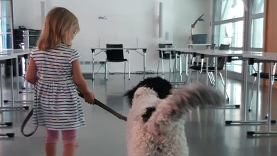 An diesem Tag lernen die Kinder Phibie oder Seppel kennen. Die beiden gehören einer seltenen Rasse an: Sie sind Barbets und haben ein lockiges, weiches, braunes Fell, das nicht haart (Allergikerhund). Als ausgebildete Therapiehunde helfen sie dabei, Kindern die zwölf goldenen Regeln im Umgang mit einem Hund beizubringen.