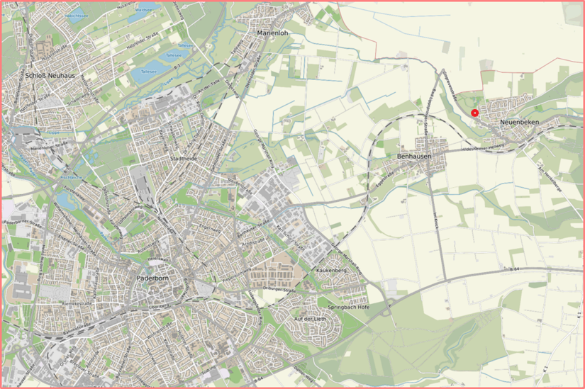 Das Baugebiet "Wiebach West" liegt am westlichen Ortsrand von Neuenbeken, etwa 7 Kilometer nordöstlich des Stadtzentrums von Paderborn.