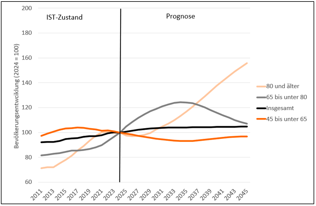 Im Prognosezeitraum verändert sich auch die Bevölkerungszusammensetzung: Besonders der Anteil älterer Menschen steigt deutlich. Mit dem Eintritt der sogenannten Babyboomer-Generation ins Seniorenalter wächst zunächst der Anteil der 65- bis unter 80-Jährigen überdurchschnittlich. Der Anteil der über 80-Jährigen war bereits in den letzten Jahren stark gestiegen, und dieser Trend setzt sich fort.