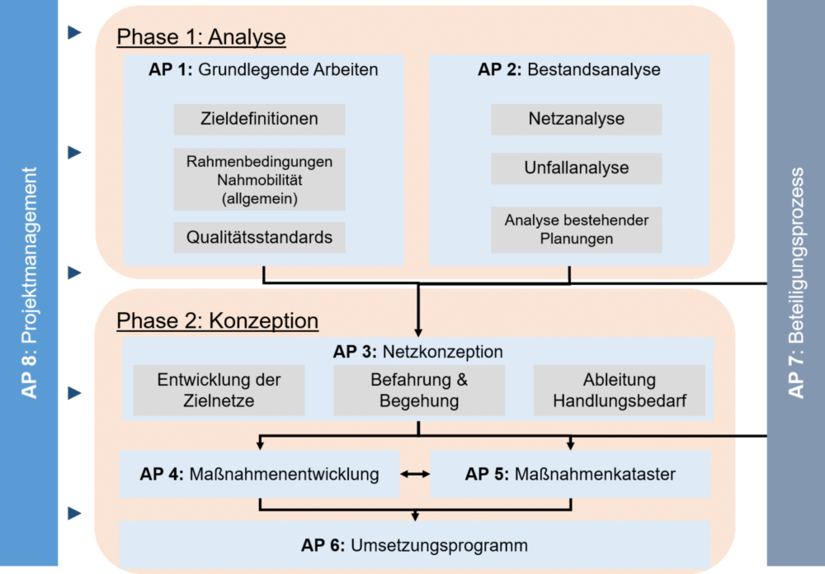 Das Nahmobilitätskonzept der Stadt Paderborn gliedert sich in verschiedene Projektphasen. Zu Beginn wurde eine umfassende Analyse der aktuellen Fuß- und Radverkehrssituation im Stadtgebiet durchgeführt, in die auch bestehende Planungen sowie das Unfallgeschehen einbezogen wurden. Anschließend erfolgte die Entwicklung sicherer und komfortabler Netze, die sowohl innerörtliche als auch überörtliche Verbindungen abdecken, klar strukturiert sind und Qualitätsstandards definieren. In der Abschlussphase wurden darauf aufbauend zielgerichtete Maßnahmen zur Stärkung der Nahmobilität erarbeitet. Diese sind im Endbericht dokumentiert.