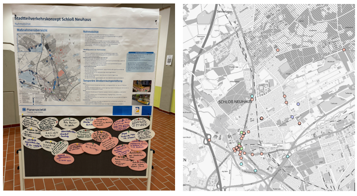 Am 10. Oktober 2024 hatten interessierte Bürger*innen die Möglichkeit, sich im Foyer des Gymnasiums Schloß Neuhaus über das Stadtteilverkehrskonzept Schloß Neuhaus zu informieren. Ca. 40 Bürger*innen haben diese Gelegenheit wahrgenommen und Fragen/Anregungen/Hinweise zum Thema Verkehr in Schloß Neuhaus und Sande gegeben. Insbesondere zu den Themen Nahmobilität sowie Kfz-Verkehr und Straßenraumgestaltung gab es einige Anregungen.