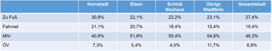 - in der Kernstadt ist der MIV-Anteil mit ca. 40 % am niedrigsten, in Elsen, Schloß Neuhaus und den übrigen Stadtteilen liegt er bei über 50 %
