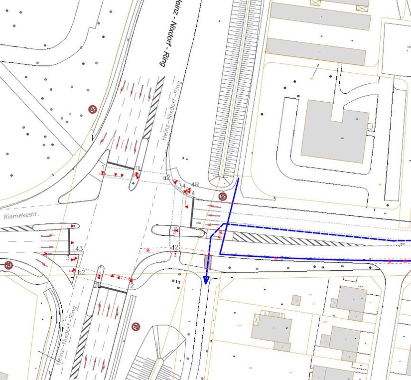 Vor der Kreuzung mit dem Heinz-Nixdorf-Ring bietet eine Aufstellfläche auf der Riemekestraße, zwischen der Mittelinsel und der Sperrfläche, Radlern die Möglichkeit die Riemekestraße zu queren, ohne die Signalanlage nutzen zu müssen. Sowohl die Radler die den Radweg parallel zum Heinz – Nixdorf – Ring weiter geradeaus befahren, als auch die Radler die von der Riemekestraße auf den Radweg abbiegen wollen (und umgekehrt) können diese Aufstellfläche zur Überquerung der Riemekestraße nutzen. Wer von der Riemekestraße links auf den Radweg am Heinz – Nixdorf – Ring abbiegen möchte, ordnet sich zunächst auf der Linksabbiegespur ein und befährt von dort aus die Aufstellfläche, wo er den entgegenkommenden Verkehr abwarten kann. Die Stadt Paderborn möchte besonders in diesem Abschnitt der Riemekestraße dem Radeln in falscher Richtung („Geisterradeln“) entgegenwirken und bietet mit dieser Aufstellfläche den Radfahrenden die Möglichkeit einer schnellen und sicheren Überquerung.