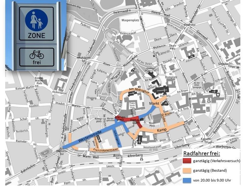 Seit 01. März 2018 sind der Rathaus- und Marienplatz für Radfahrer vorerst ganztägig freigegeben. Hierbei handelt es sich um einen Verkehrsversuch. Ein Jahr lang haben Radfahrer jetzt somit die Möglichkeit, die Innenstadt auf der Verbindungsachse Kamp – Marienstraße durchgängig zu befahren. Bisher war dies nur in der Zeit von 20 Uhr bis 9 Uhr erlaubt. Zu den Veranstaltungen, wie dem Frühlingsfest oder dem Weihnachtsmarkt, gilt die Regelung nicht.