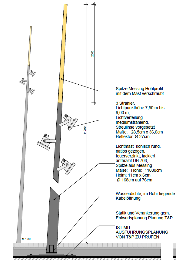 Auf den Plätzen kommen Mastleuchten mit einer Höhe von 11 Metern zum Einsatz. Die Leuchten befinden sich jeweils in einer Höhe von 7,5 bis 9 Metern an den Masten. Gemäß dem gewählten Leitmaterial werden die Spitzen der großen Mastleuchten mit einem Messingbeschlag versehen.