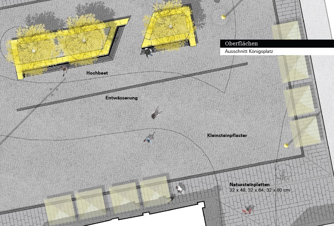 Die gesamte Fläche der Königsplätze bekommt einen einheitlichen neuen, barrierefreien Bodenbelag, der das verbindende Element im neu gestalteten Quartier darstellt.