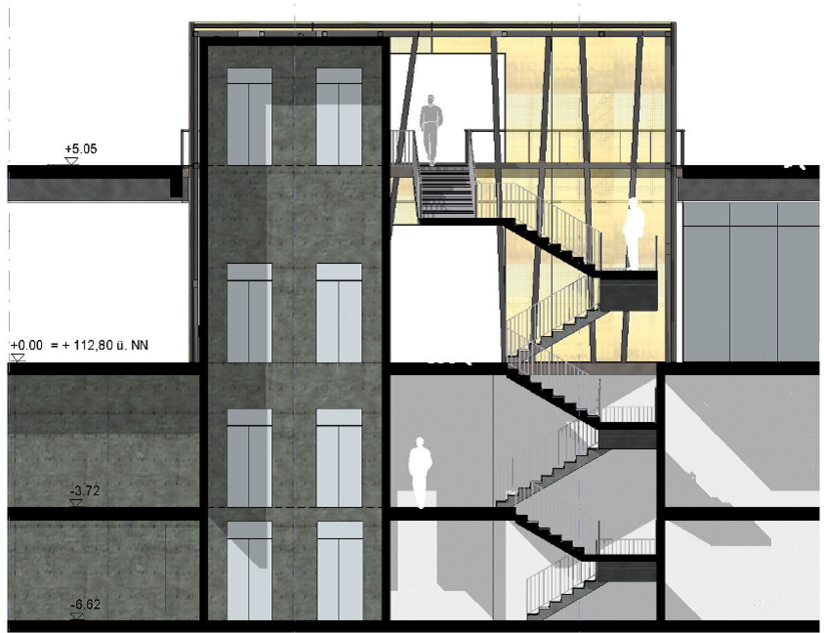 Das Zentrale Erschließungselement (ZEE) soll die Orientierung im revitalisierten Quartier verbessern und die barrierearme Erschließung aller Ebenen ermöglichen. Bisher bestehende Rolltreppen und ein Teil der Aufzüge auf den Königsplätzen werden durch ein Erschließungsgebäude mit wegweisender Signalwirkung ersetzt.